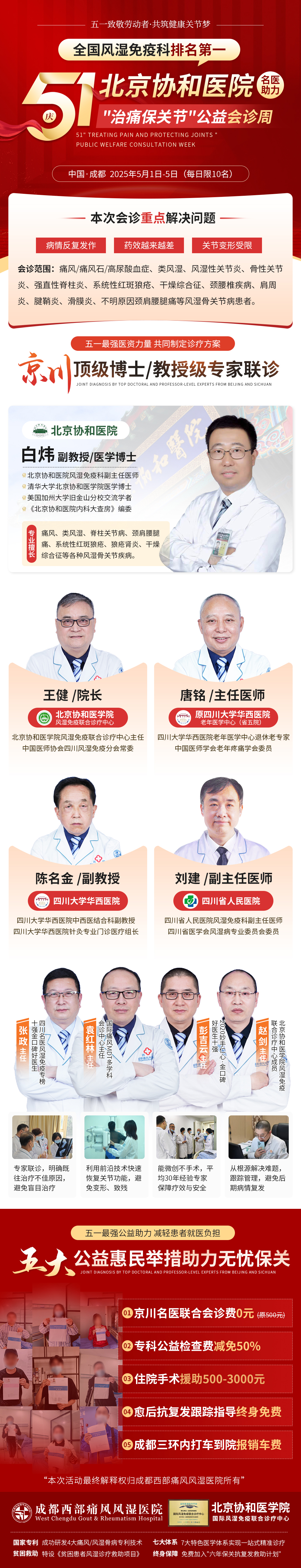 劳动者的汗水浇灌城市的繁华,健康的关节支撑奋斗的力量!值此五一国际劳动节之际,成都西部痛风风湿医院特邀北京协和医院风湿免疫科‌白炜教授领衔‌<5·1治痛保关节公益会诊周>‌ ——专治各种“治不好”“反复痛”“不敢动”,助力痛风、风湿骨关节病患者重获行动自由,拥抱无痛人生!